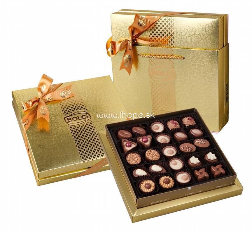 Luxusná bonboniéra v elegantnom zlatom boxe s praktickou taškou, ktorá pôsobí ako hotový darček bez ďalšieho balenia. Elegantný mix mliečnych, horkých aj bielych praliniek v luxusnom darčekovom balení, ktoré poteší na prvý pohľad aj na prvé sústo. Jemné krémy, chrumkavé oriešky, kúsky kakaových bôbov aj dotyk pomaranča vytvárajú pestrú kolekciu chutí pre výnimočné chvíle.