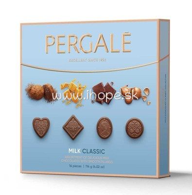 Výber Pergale Milk Classic prináša mliečne čokoládové kúsky s rôznymi náplňami v elegantnom svetlom balení. Lahodná čokoládová kombinácia poteší pri chvíľke pohody aj ako štýlový darček.