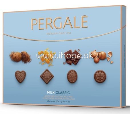 Výber Pergale Milk Classic prináša mliečne čokoládové kúsky s rôznymi náplňami v elegantnom svetlom balení. Lahodná čokoládová kombinácia poteší pri chvíľke pohody aj ako štýlový darček.