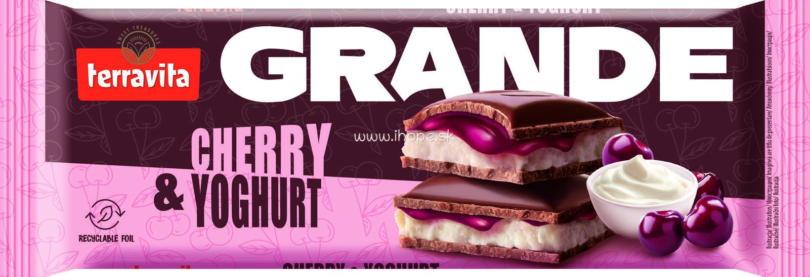 Mliečna čokoláda Terravita Grande s osviežujúcou višňovou náplňou a jemnou jogurtovou vrstvou. Lahodné spojenie čokolády, višní a smotanovej chuti pre milovníkov sviežich kombinácií.