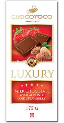 Chocoyoco Luxury Milk Chocolate s mandľami a jahodou prináša jemnú sladkú kombináciu čokolády, ovocia a chrumkavých kúskov mandlí.
