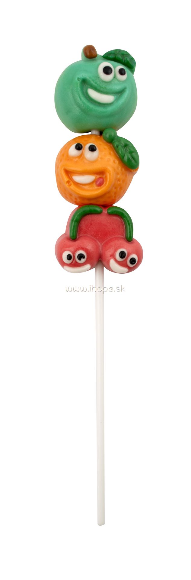 Farebné lízanky v tvare ovocia – čerešňa, jablko, pomaranč, malina a citrón.