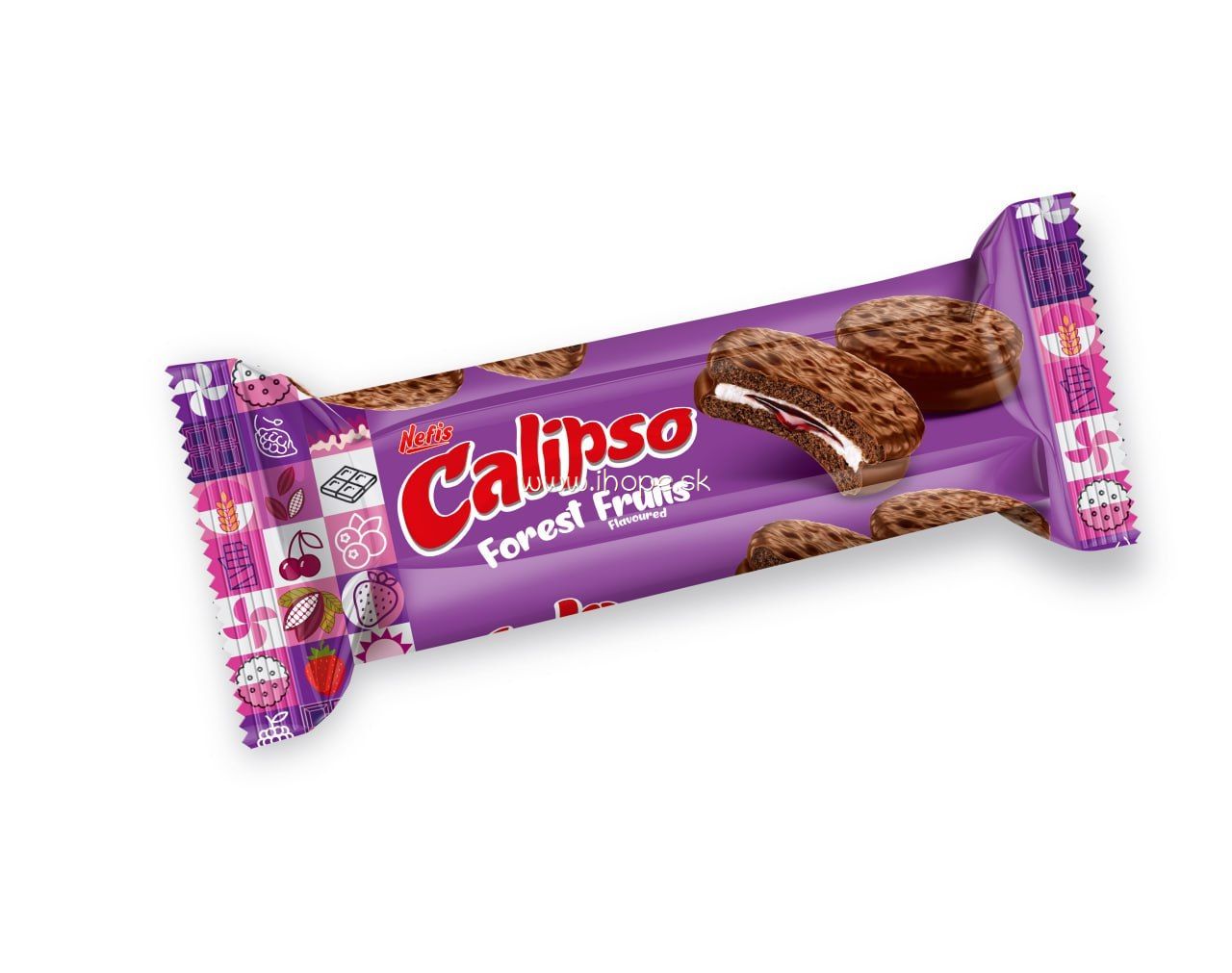 Sendvičové kakaové sušienky v kakaovej poleve s marshmallow a želé náplňou a príchuťou lesného ovocia.