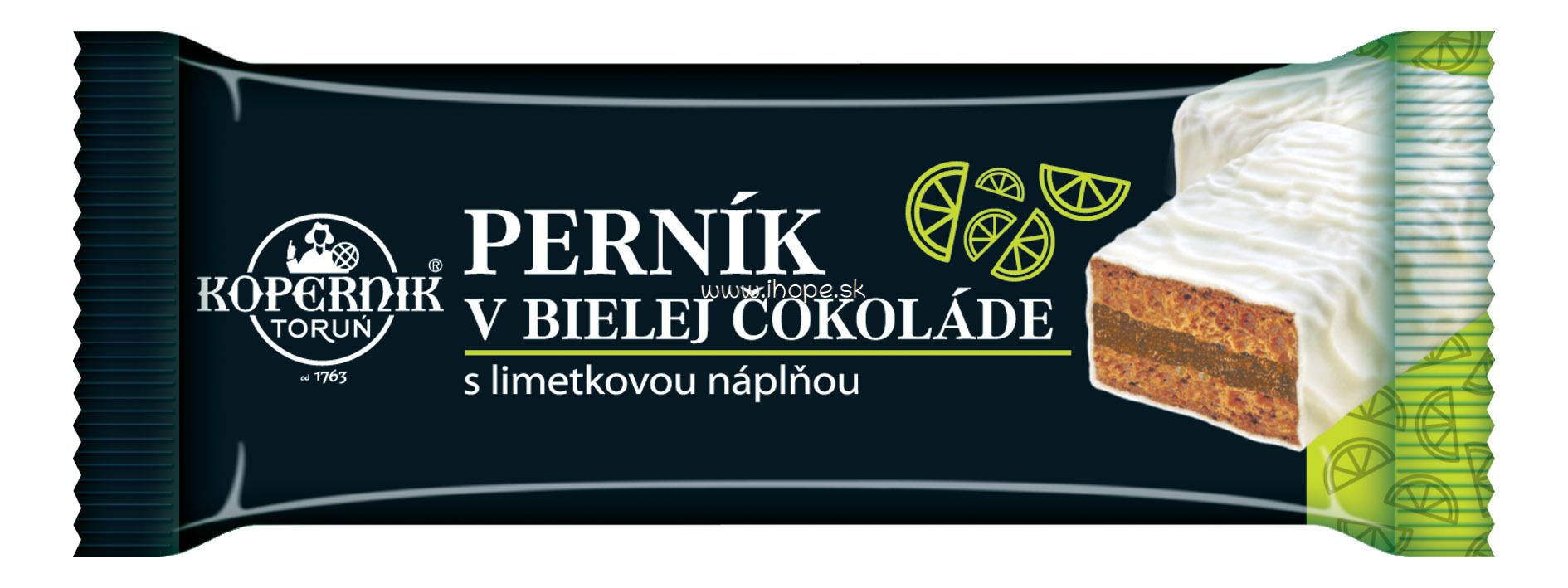 Jemný perník značky Kopernik obalený v lahodnej bielej čokoláde. Vnútri sa ukrýva svieža limetková náplň (33%) s ovocnou kyselkavou chuťou, ktorá vytvára dokonalý kontrast s jemnou sladkosťou čokolády. Originálna kombinácia pre milovníkov netradičných perníkov.